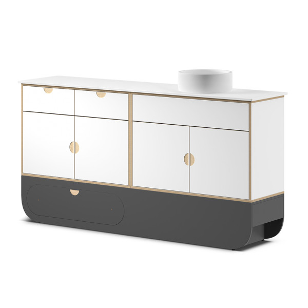 La finition gris minéral confère un look sophistiqué qui s’intègre aussi bien dans les ambiances contemporaines que dans les espaces à tonalités industrielles. Le module offre des rangements généreux avec son système Push-to-Open, idéal pour accéder rapidement aux produits, consommables ou équipements sans altérer la pureté visuelle du meuble. L’ensemble bénéficie de matériaux robustes, d’un plan de travail conçu pour durer et d’un design pensé pour optimiser la circulation et l’ergonomie.