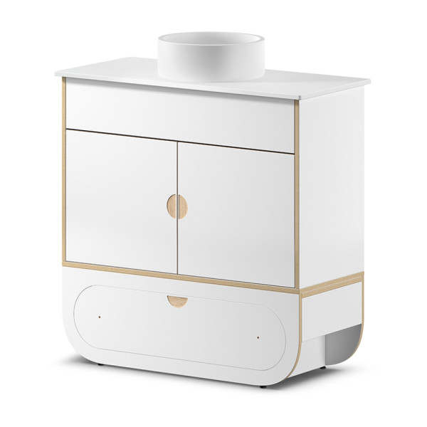 Ce modèle intègre une vasque en céramique haut de gamme, parfaitement adaptée pour les soins nécessitant un point d’eau dédié. Son plan de travail technique non poreux garantit une hygiène irréprochable tout en résistant à l’humidité, aux produits de soin et au nettoyage intensif. Le meuble comprend une armoire à deux portes avec étagère interne, ainsi qu’un tiroir « Push to Open » à fermeture douce, assurant un usage fluide et sans poignée apparente.