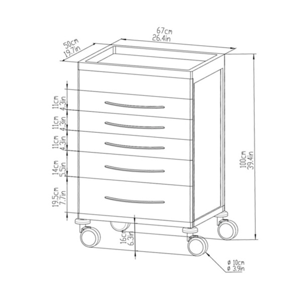Les tiroirs à fermeture douce permettent un déplacement silencieux, ce qui est particulièrement apprécié dans les zones sensibles comme les salles d’intervention ou de réveil. Leur profondeur et leur capacité de charge de 50 kg chacun garantissent un stockage sécurisé de matériel varié, allant des seringues aux ampoules, en passant par les instruments d’anesthésie et les équipements d'urgence.
