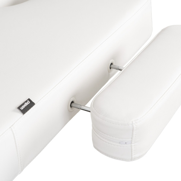 Certaines tables de massage sont équipées d'accoudoirs latéraux, qui peuvent être ajoutés ou retirés selon les besoins. Ces accoudoirs augmentent la largeur effective de la table, offrant un espace supplémentaire pour les bras du client. Cela peut être particulièrement utile pour des massages nécessitant des positions spécifiques ou pour des clients plus larges, améliorant ainsi leur confort pendant la séance.