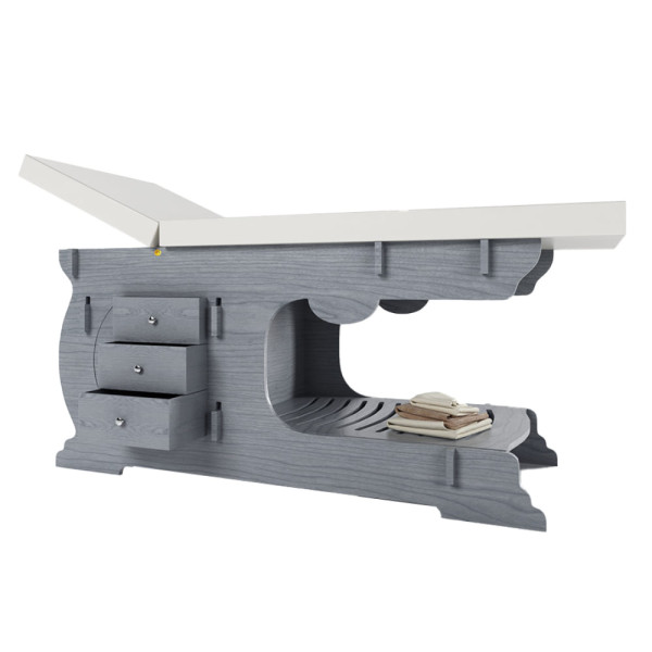Alliant esthétique et praticité, la table Napoli est équipée d’une têtière réglable grâce à des charnières en acier galvanisé, de trois tiroirs spacieux pour un rangement optimisé, ainsi que d’une étagère inférieure ornée d’élégants motifs en relief. Un porte-rouleau intégré vient compléter ses fonctionnalités, facilitant l’organisation des soins.